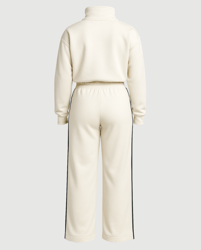 Un set que redefine el lujo deportivo. Confeccionado en algodón perchado de alto gramaje, este conjunto en tono crema envuelve el cuerpo con una textura suave, firme y elegante. El sweater presenta cuello alto estructurado con cremallera metálica y el icónico de LEBREL al frente, mientras el pantalón de silueta recta se ajusta con pretina elástica y cordón con punta metálica. Las líneas en verde profundo a los costados aportan verticalidad y contraste, evocando la estética de clubes privados y espacios de alto estándar. Pensado para una mujer que exige comodidad sin renunciar al estilo.